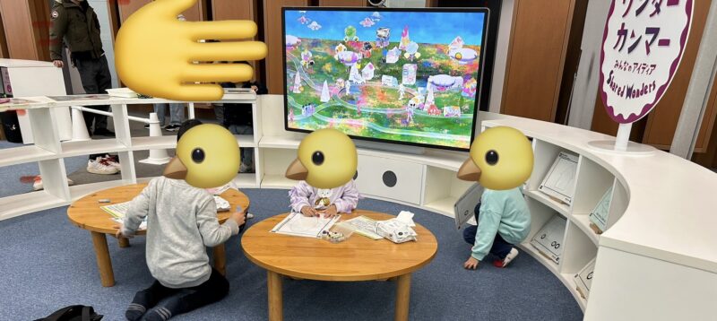 45分の入れ替え制ですが、ぎりぎりまで工作をしてしまったせいで、残りが5分。残りの時間を最大限使って、塗り絵を楽しみます。自分が塗った絵を近くにある機械でスキャンすると、モニターに反映される仕様です。自分の作品が画面に出てくる瞬間がやっぱり1番楽しそうです。